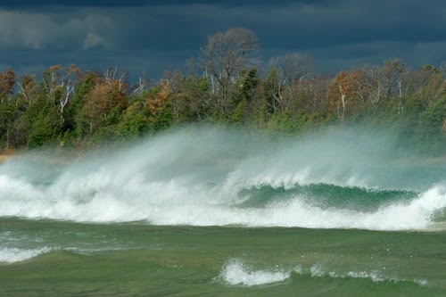 I decided to head down to The Charlevoix area and visited the beaches at Fisherman's Island and Norwood. Norwood was a last minute alternate as I found that the road to Fisherman's was blocked due to a power line down. At the Norwood beach I was struck by the rainbows formed in the blowing spray from the waves (see below). Eventually I was able to get into Fisherman's Island where the show was all about the the giant plumes of spray kicked up as the waves crested. The island, a natural barrier that juts out into the lake, causes the wave action to curl around it so on the north side of the island the waves approach the beach heading south — directly into the wind in this case. Just as the waves would crest the wind gust would blow the wave backward in large arcs. With the background of late autumn trees on the island it presented a wonderful place for picture making.